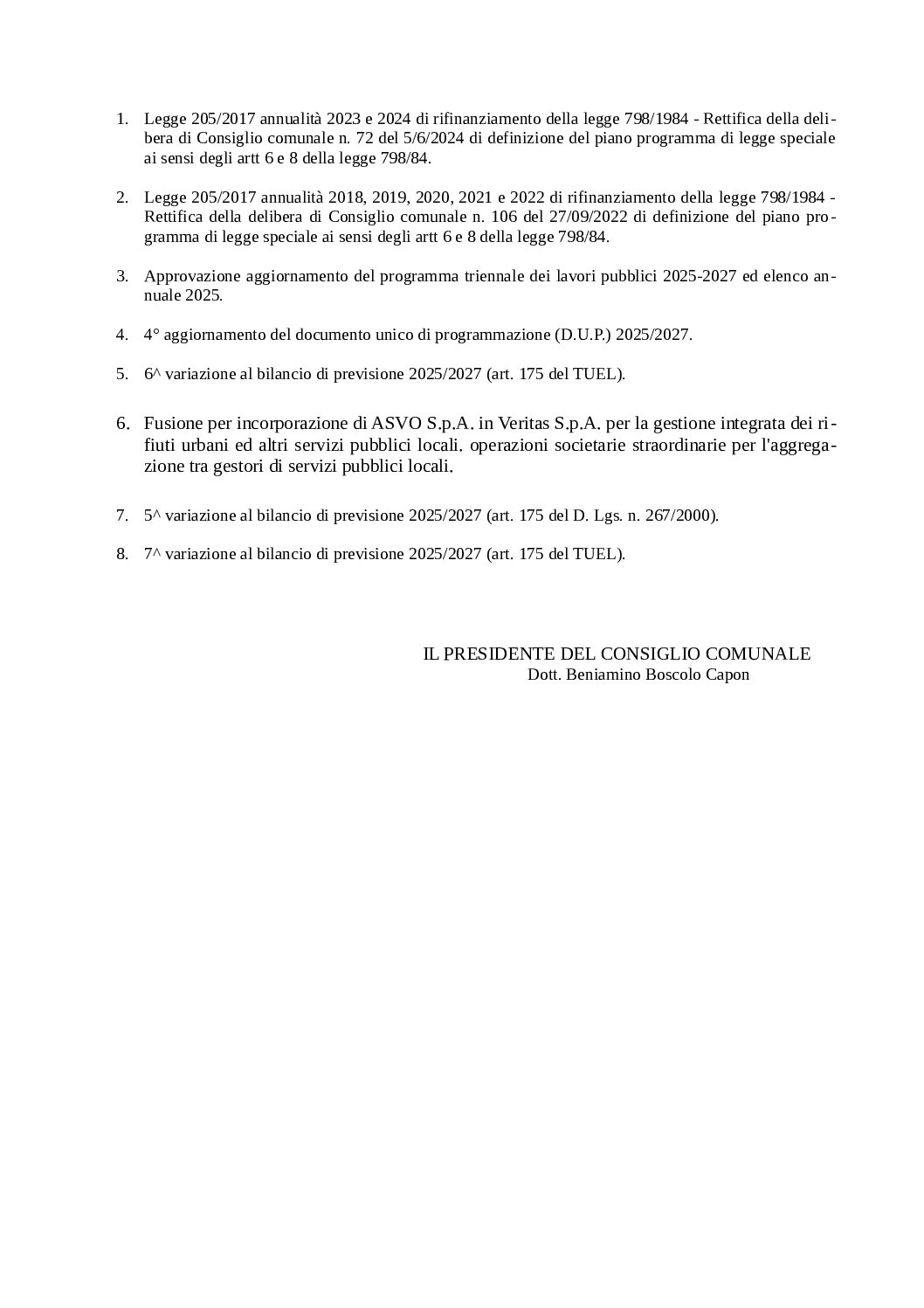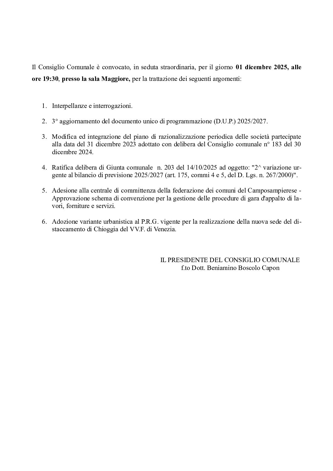 Descrizione Si informa che il Consiglio Comunale è convocato per il giorno 01 dicembre 2025, alle ore 19:30 presso la Sala Maggiore.