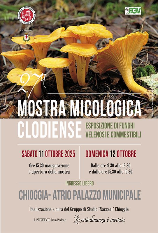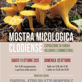 Sabato 11 alle ore 15.30 verrà inaugurata, negli spazi dell'atrio del Palazzo Municipale, la 27^ mostra micologica clodiense organizzata dal Gruppo di Studio "Naccari".
