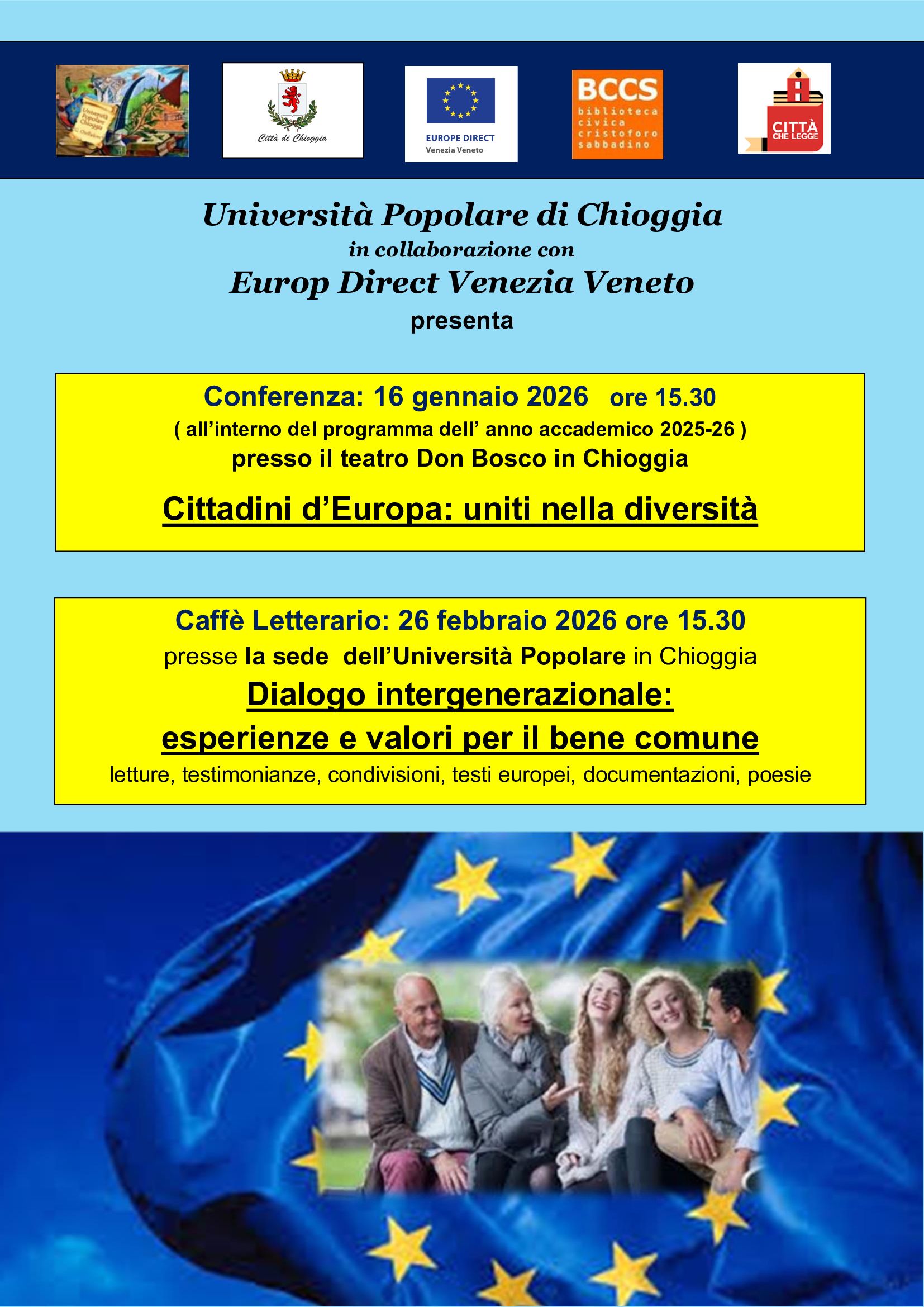 L'Università Popolare di Chioggia, nell'ambito del calendario Anno Accademico 2025-26, presenta due incontri sul tema: Cittadini d' Europa: uniti nella diversità.